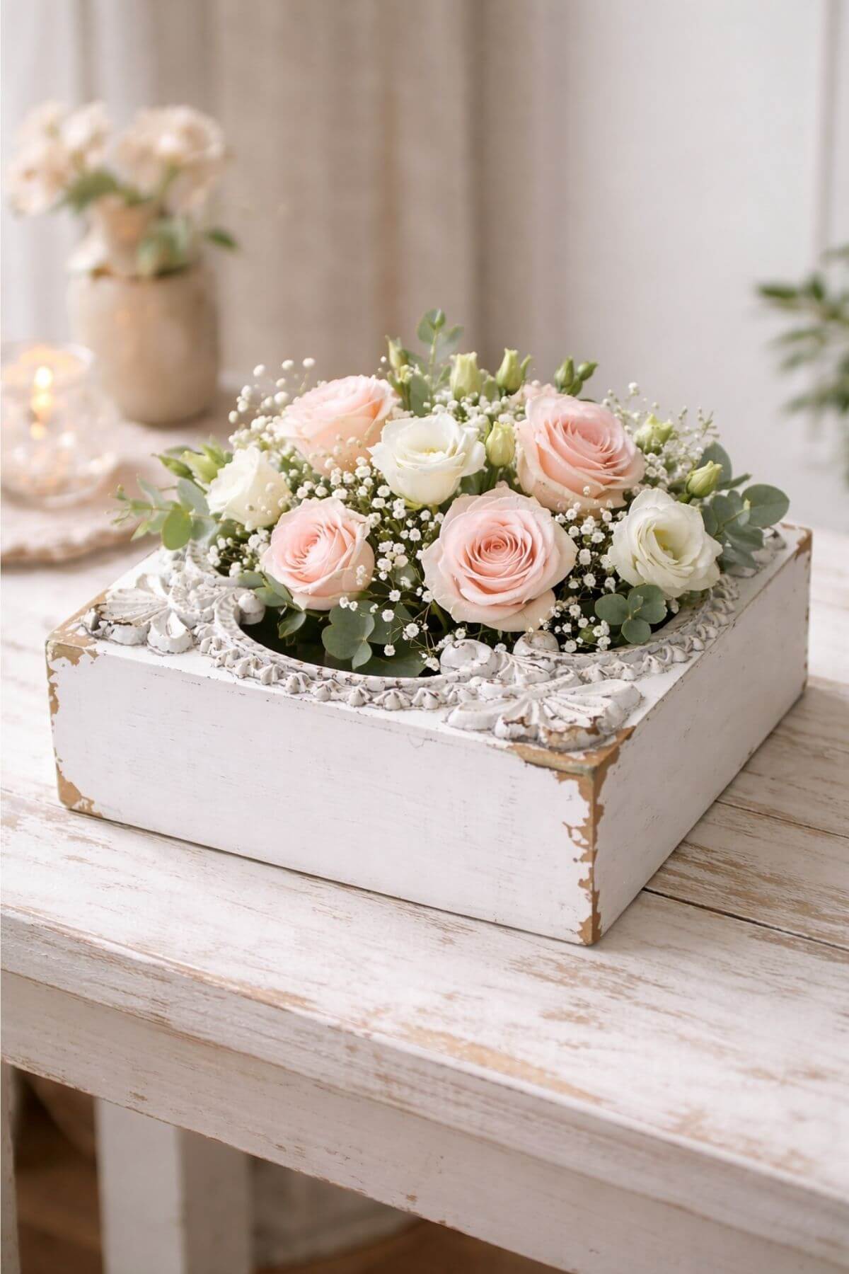 Bílá dřevěná vintage krabička s ornamentem vhodná k aranžování