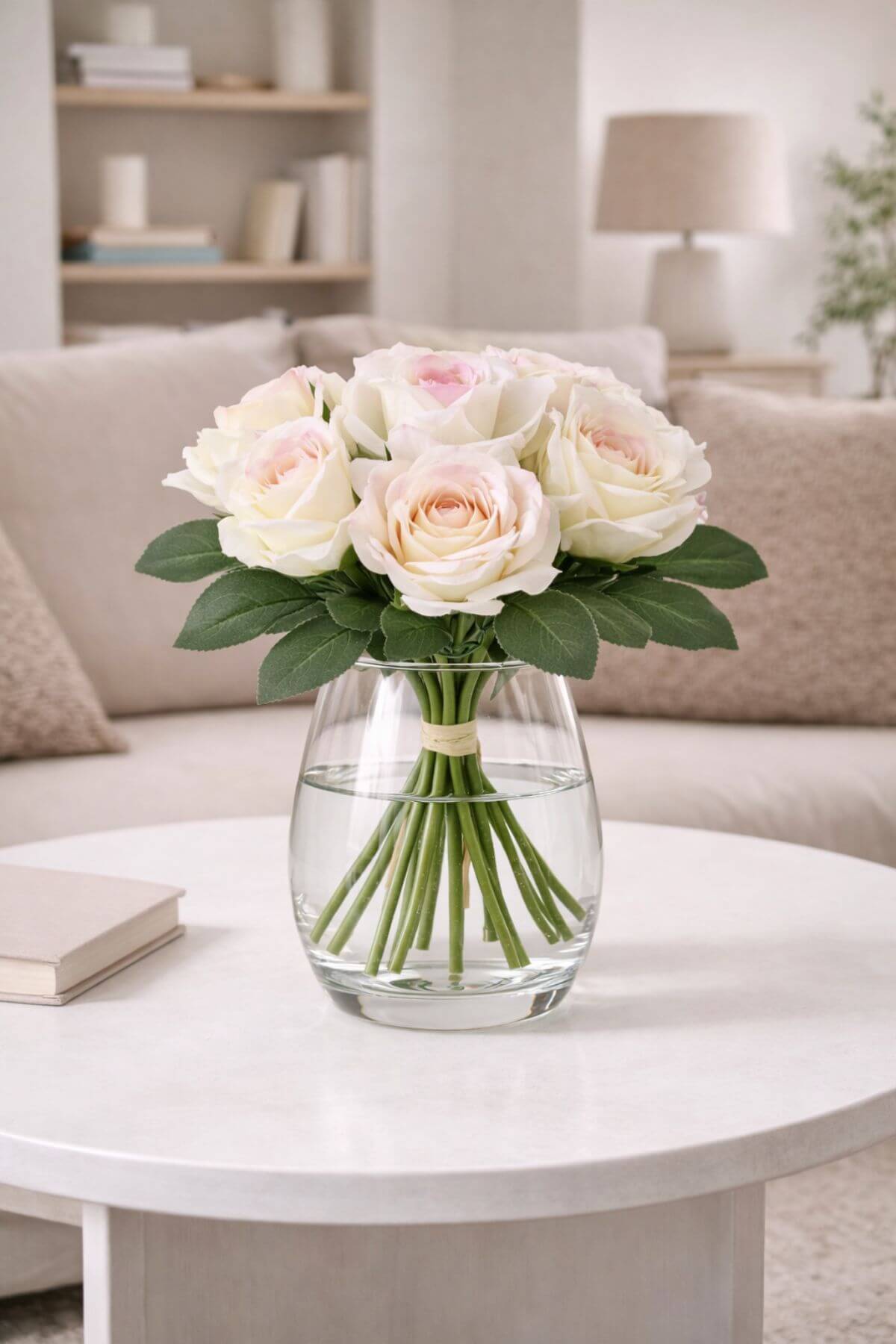 Bílá kytice růží s poupaty v růžovém odstínu, převázaná šeříkem