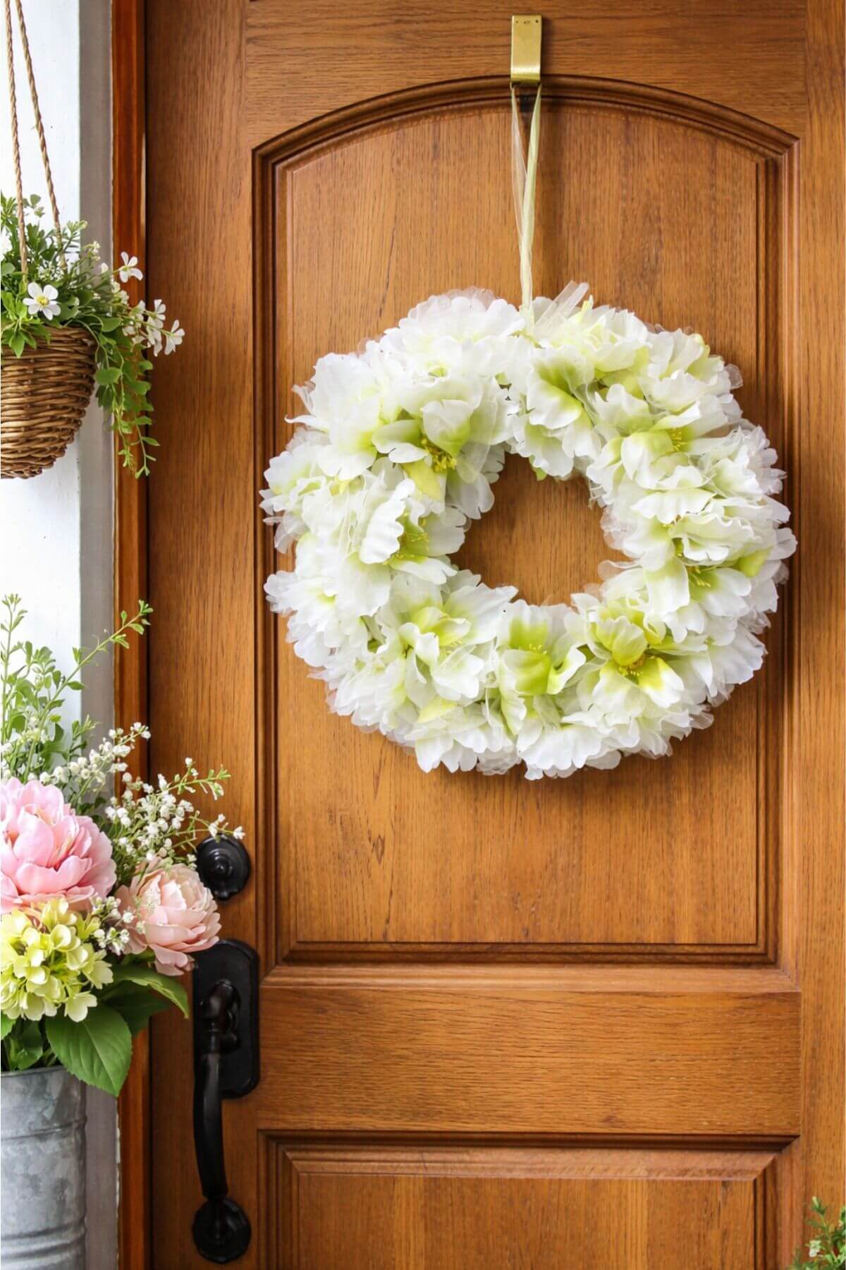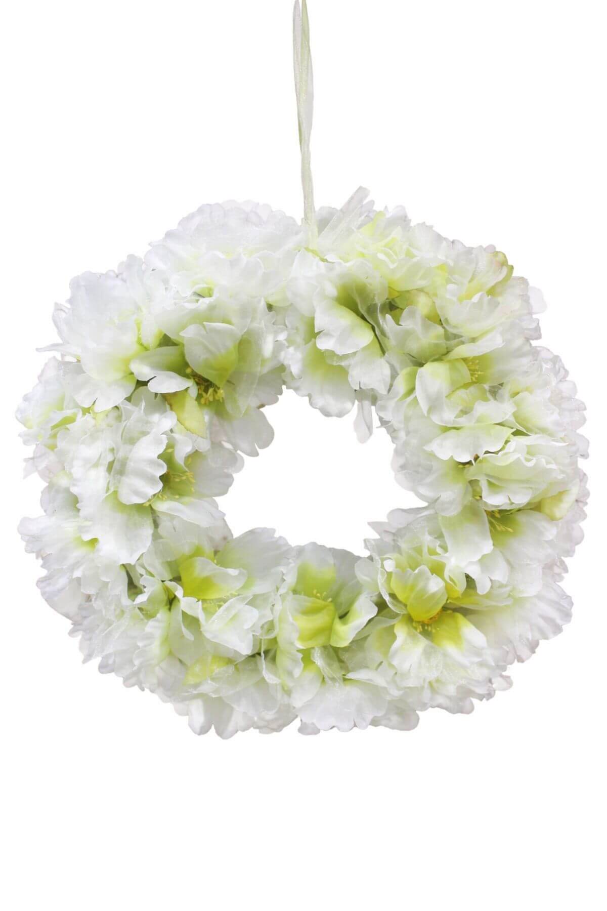 Bílozelený světlý květinový věnec na dveře vhodný jako jarní dekorace