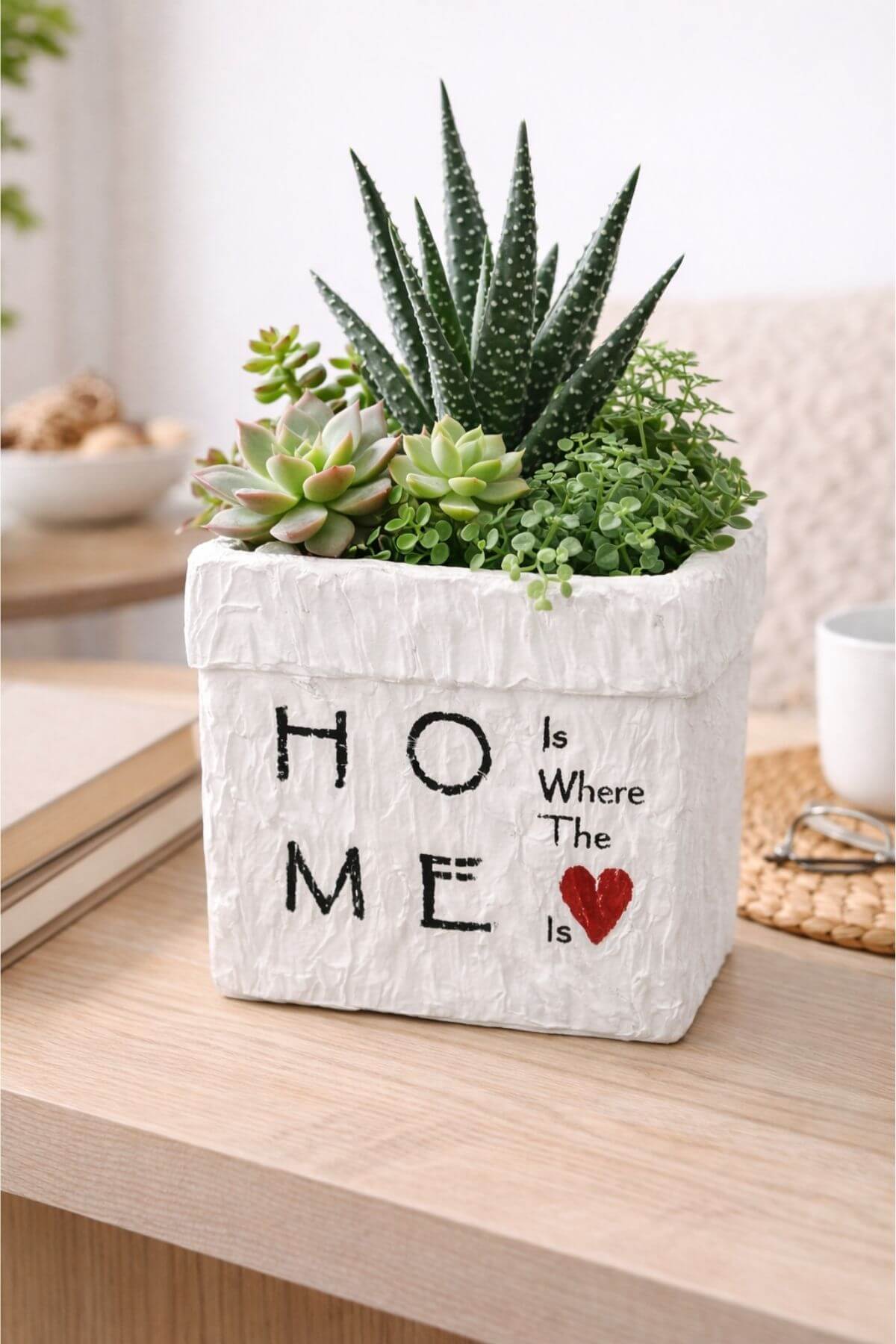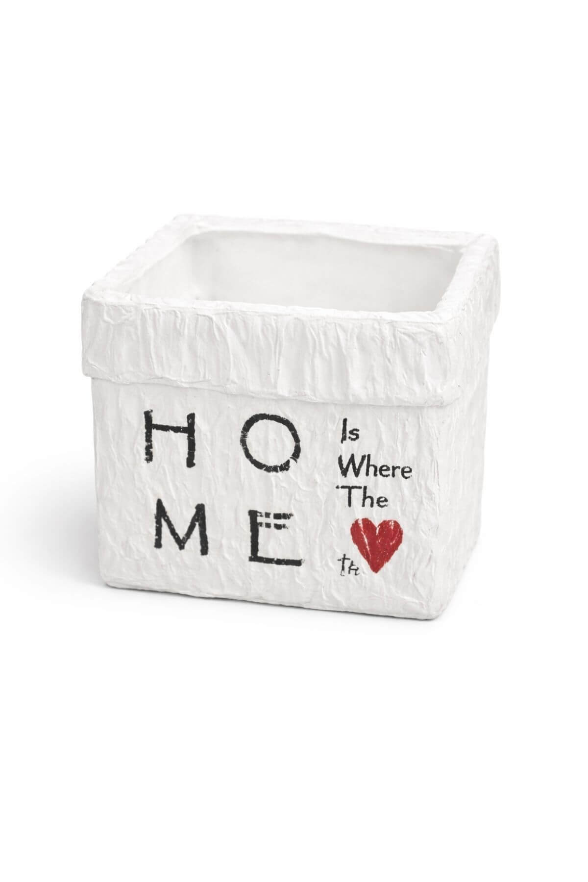 Bílý čtvercový keramický květináč ve vintage stylu s popisem na povrchu Home is where the love is v překladu Domov je tam, kde je láska.