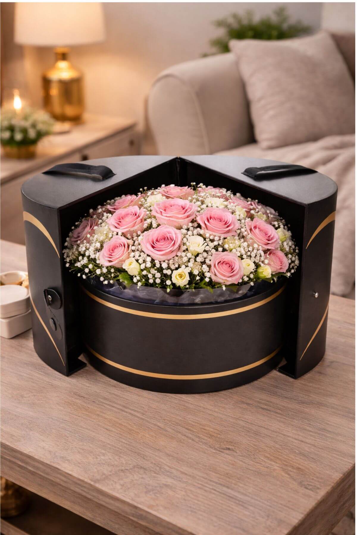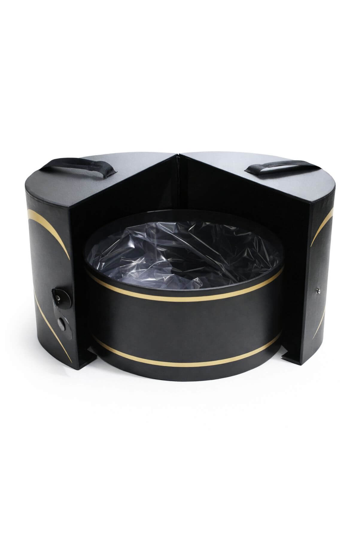 čierny flowers box tvaru valca so zlatým srdiečkom otvoritelný zaistený cvokom.Po otvorení sa ukáže nádoba na aranžovanie vystlaná celofánom.