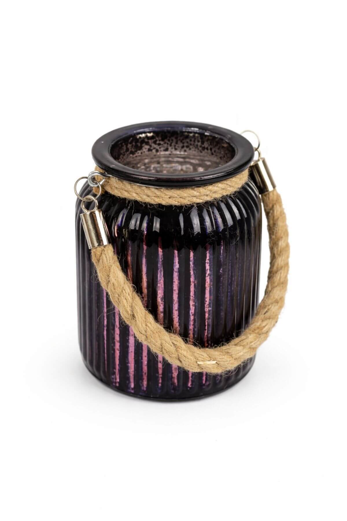 Fialový tmavý skleněný svícen s lanem 14cm