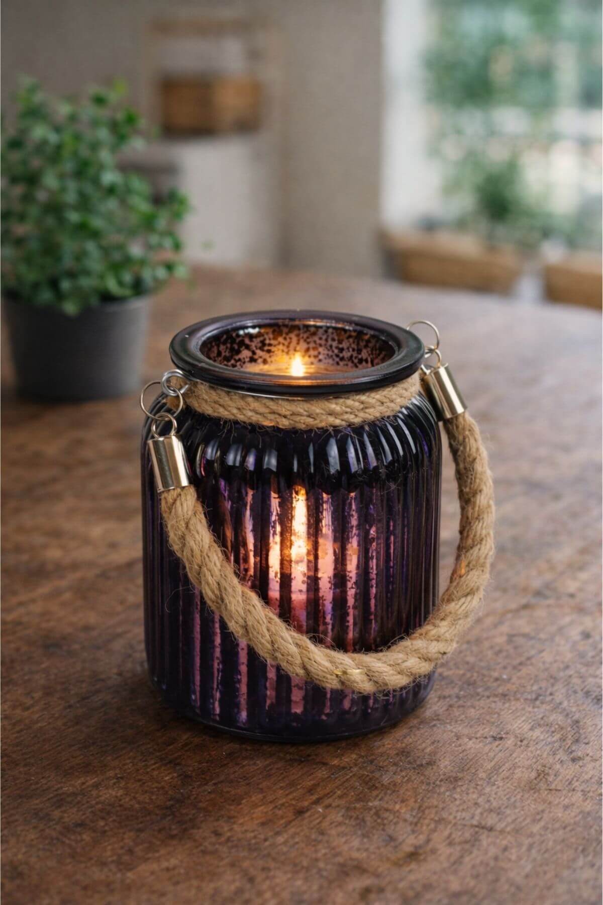 Fialový tmavý luxusní svícen se stříbrným vnitřkem s tečkovaným vzorem, kterým proniká světlo. Svícen má hnědou jutovou rukojeť. Svícen je vhodný na stůl.