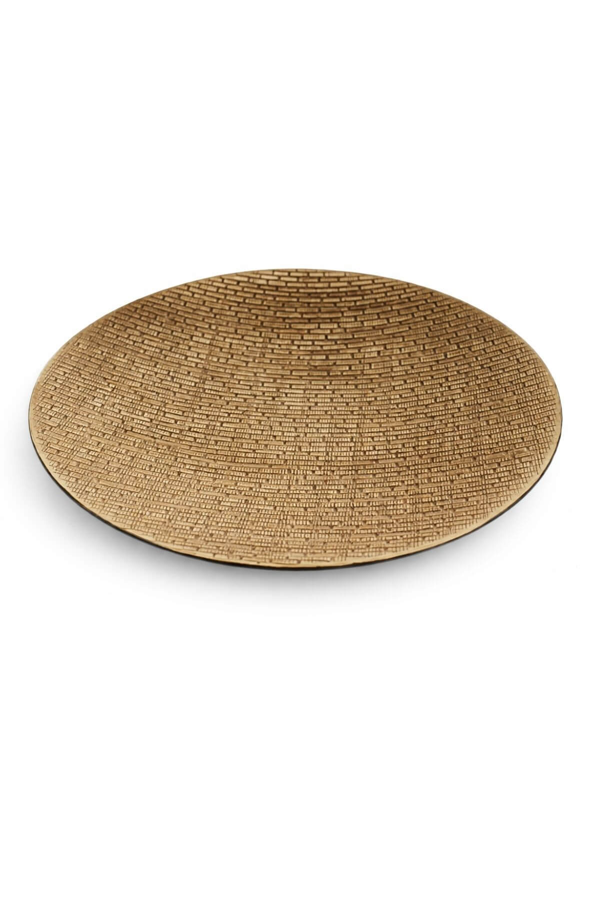 Hnědá kulatá mísa na ovoce v cihlovém designu vhodná na stůl v obývacím pokoji.