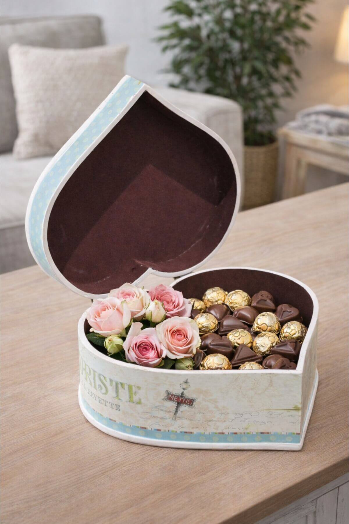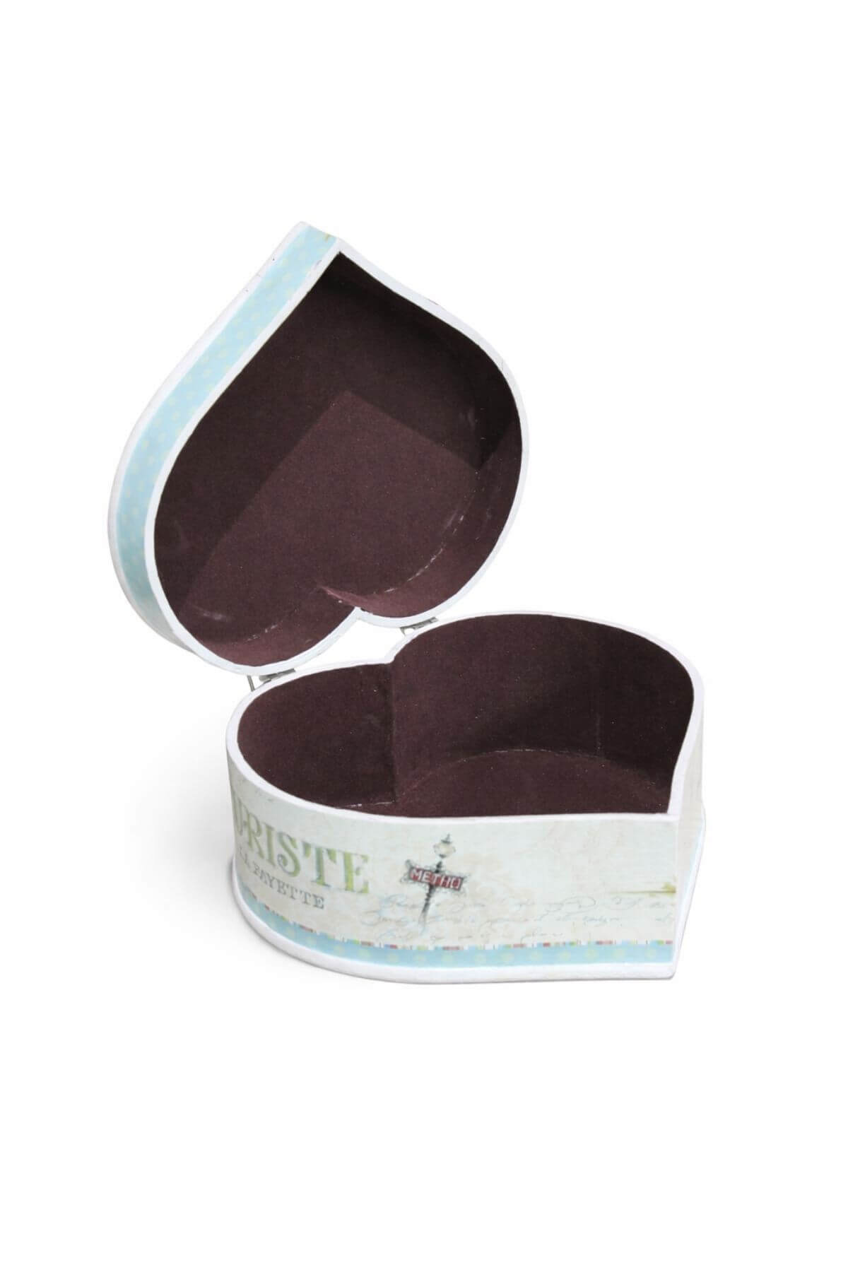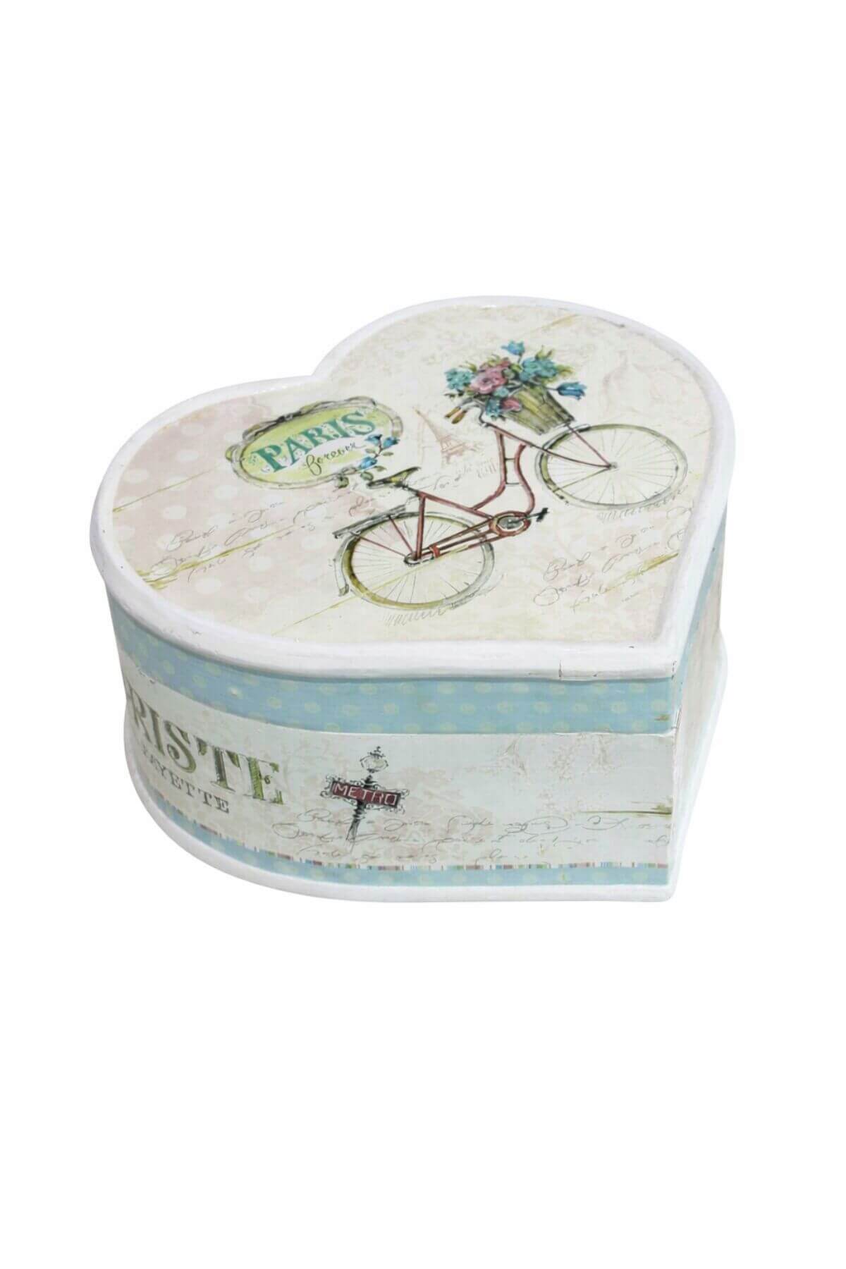 Barevná dřevěná krabička ve tvaru srdce v pařížském ošuntělém designu. Krabička má uvnitř hnědou látku. Lze ji použít jako dekoraci nebo k uložení různých drobností. Vhodné jako dárek