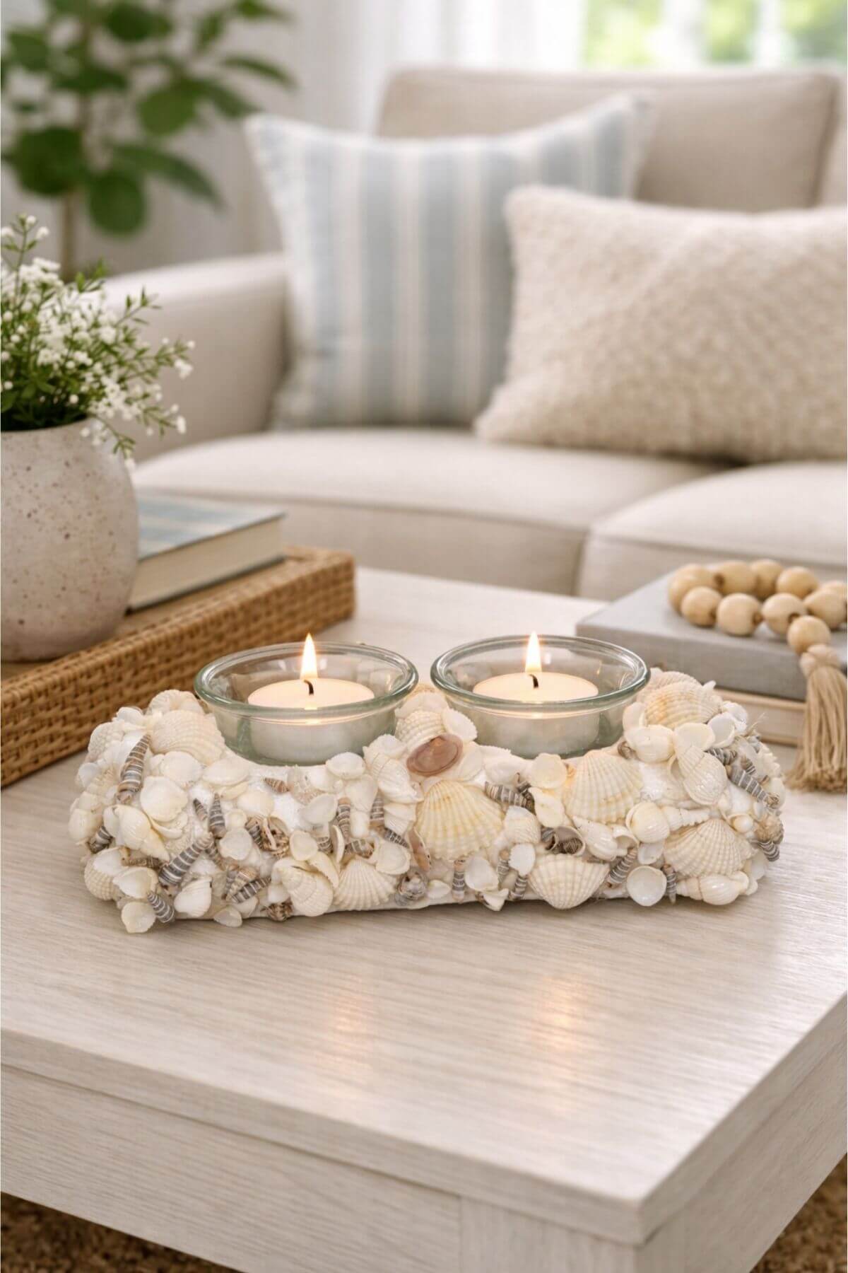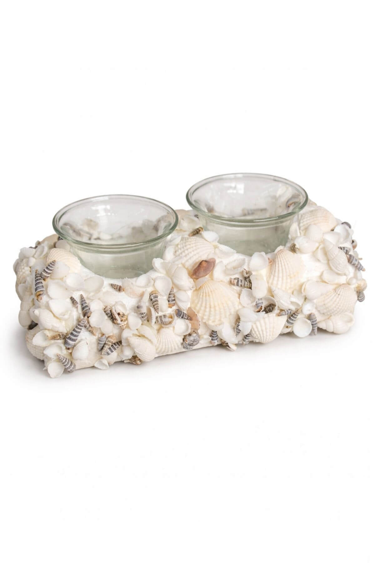 Krémově bílý svícen z mušlí na dvě čajové svíčky.