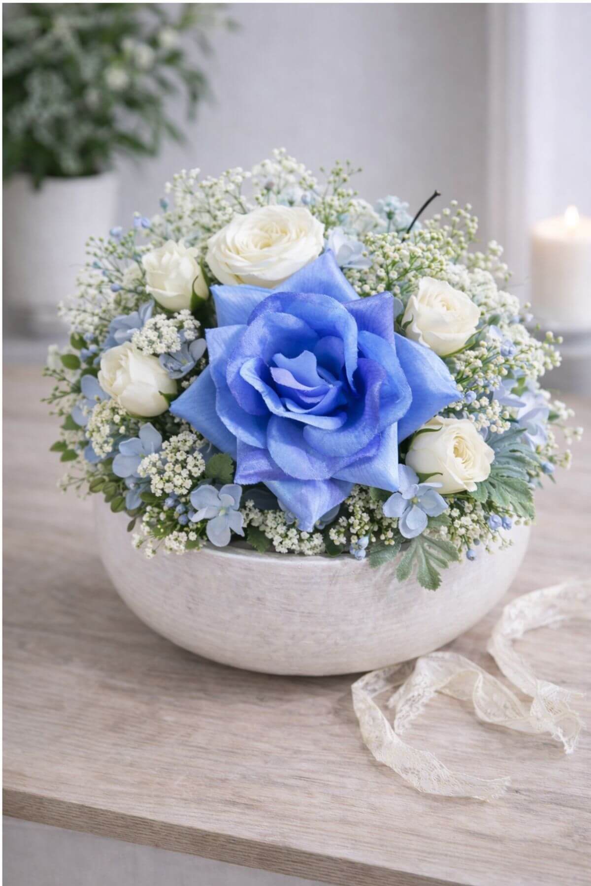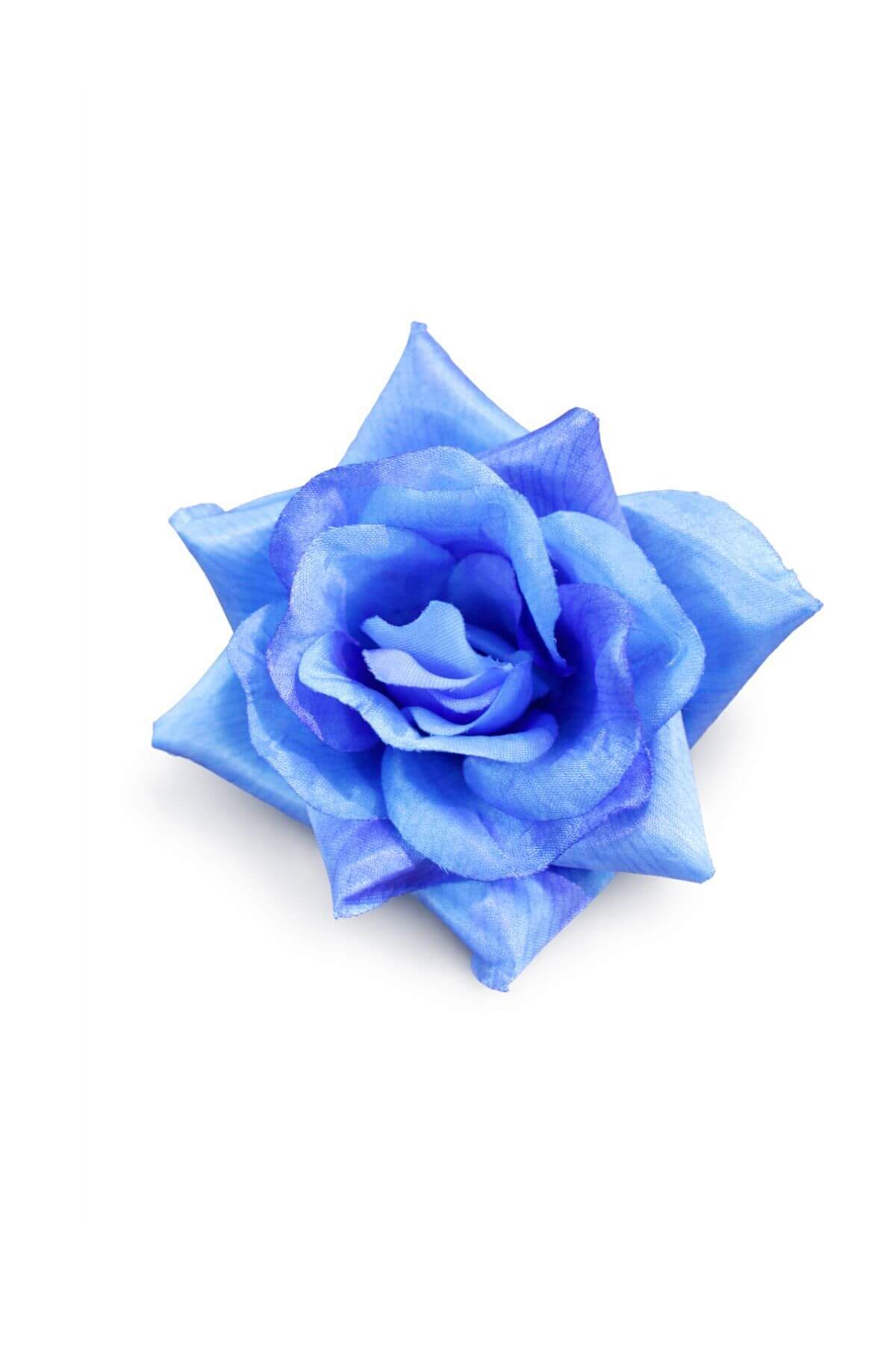Modrá saténová hlavička růže vhodná k aranžování různých věnců, dekorací a ikeban.