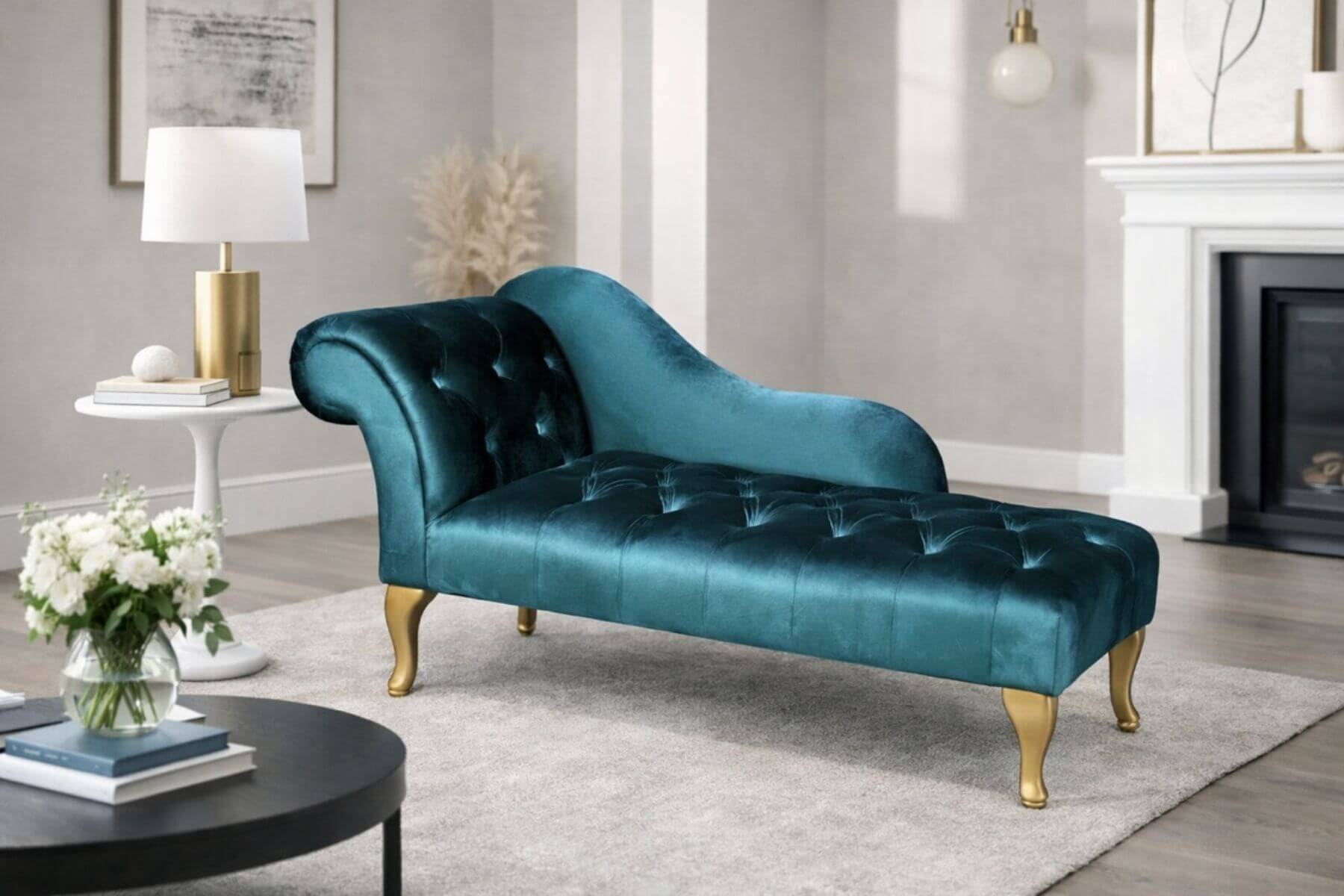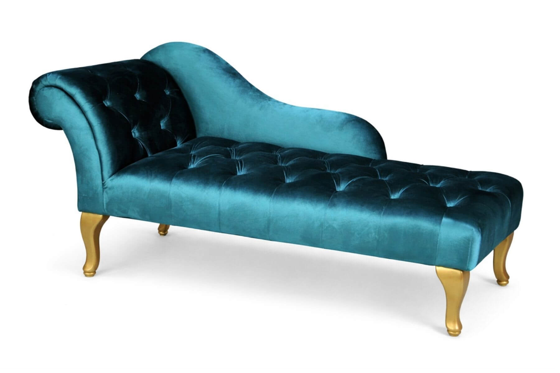 Sametové relaxační křeslo, pohovka příjemná na dotek ve smaragdově modré barvě s luxusním prošíváním v designu Chesterfield s dřevěnými nohami ve zlaté barvě je díky svému tvaru velmi pohodlná. Hodí se nejen do luxusně zařízených interiérů.