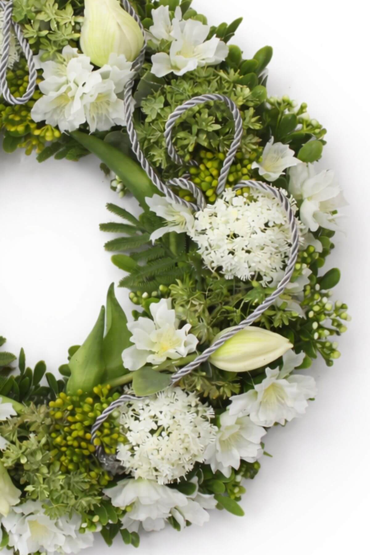 Bílý věnec na dveře může být krásnou dekorací během jarního a letního období nejen v interiéru, ale můžete jej zavěsit také na vchodové dveře vašeho domova, hotelu, kavárny či restaurace.