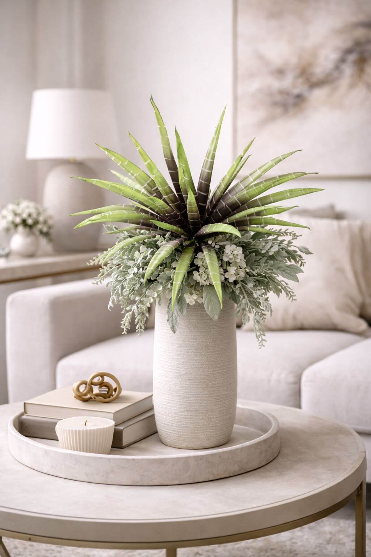 Zeleno-hnědá umělá sansevierie, která má na stonku 25 výhonků.